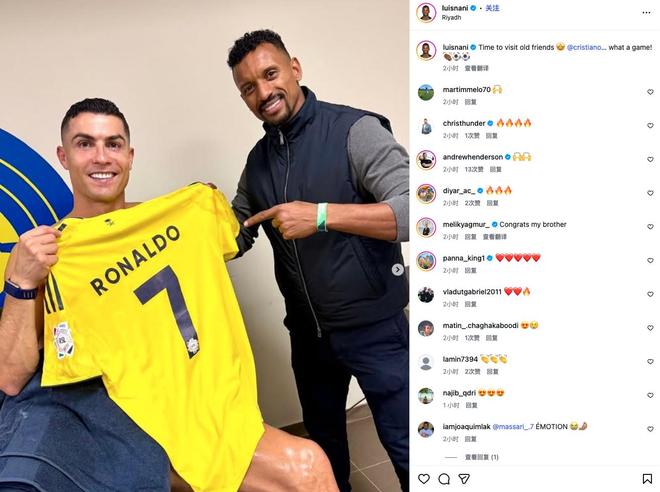 比賽中,利雅得勝利最終以3-0獲勝,C羅梅開二度。納尼在同一條動態(tài)中還表示:“克里斯蒂亞諾,這場比賽踢得太棒了!”納尼與C羅除了一同效力葡萄牙國家隊(duì)外,還曾在曼聯(lián)并肩作戰(zhàn),時(shí)間為2007-2008賽季和2008-2009賽季。
