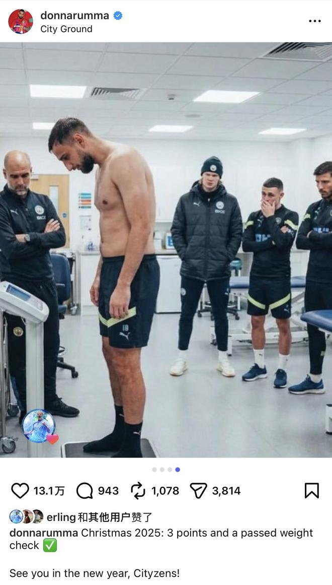 多納魯馬在社媒上表示:“2025年的圣誕節(jié),三分到手,體重檢測合格,明年再見了,城民們?!彼瑫r發(fā)布了多張比賽照片,以及一張在瓜迪奧拉嚴(yán)格監(jiān)督下進(jìn)行稱重的畫面,顯示球隊在節(jié)日期間依然嚴(yán)格執(zhí)行體重管理制度。