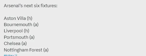阿森納未來(lái)6場(chǎng)比賽:主戰(zhàn)維拉、客戰(zhàn)伯恩茅斯、主戰(zhàn)利物浦、客戰(zhàn)樸茨茅斯、客戰(zhàn)切爾西、客戰(zhàn)諾丁漢森林。